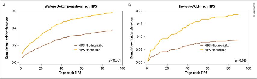 Abb. 1: Wahrscheinlichkeit des Auftretens einer weiteren Dekompensation (A) sowie eines De-novo-ACLF (B) nach TIPS (unter Berücksichtigung von Tod und Lebertransplantation als konkurrierende Risiken) innerhalb von 90 Tagen (kumulative Inzidenzfunktion) bei FIPS-Hochrisiko- sowie Niedrigrisikopatient:innen (modifiziert nach Sturm L et al. 2025)1