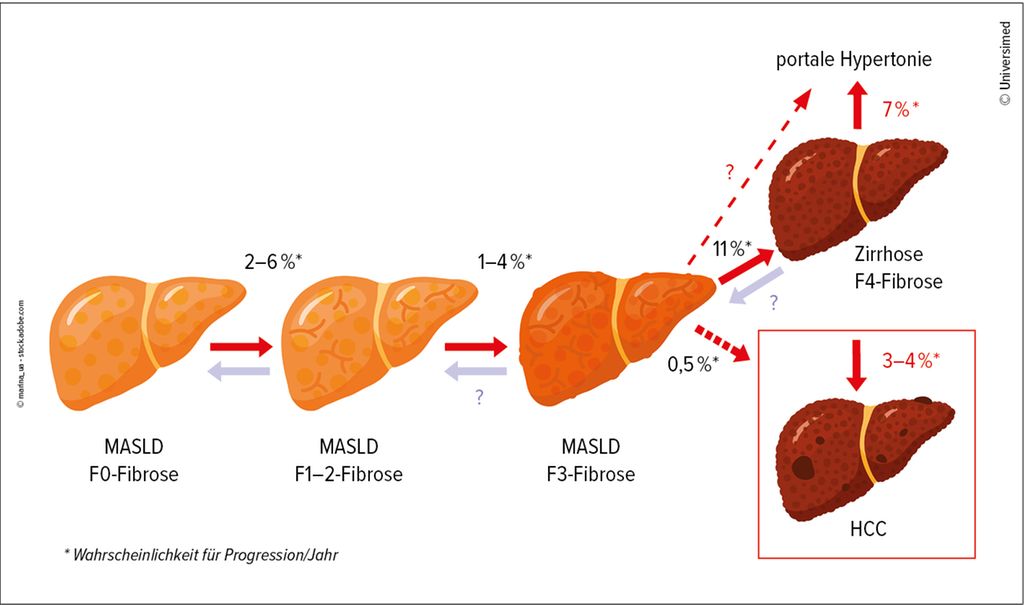 Abb. 1: Progression chronischer Hepatopathien (z.B. MASLD) bis zum Endstadium mit Zirrhose und hepatozellulärem Karzinom (HCC)
