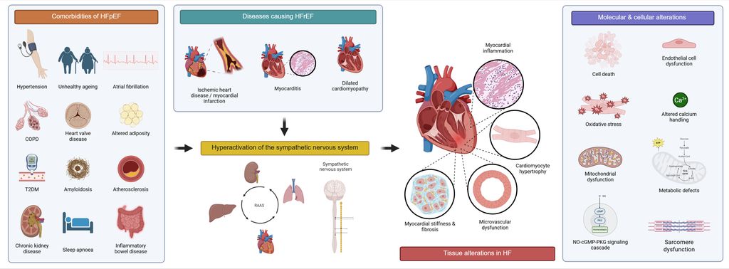 1 Khan MS et al.: Global epidemiology of heart failure. Nat Rev Cardiol 2024; 21(10): 717-34 2 Hamo CE et al.: Heart failure with preserved ejection fraction. Nat Rev Dis Primers 2024; 10(1):55 3 Alcaide P et al.: Myocardial inflammation in heart failure with reduced and preserved ejection fraction. Circ Res 2024; 134(12): 1752-66 4 Méndez-Fernández A et al.: Distinguishing pathophysiological features of heart failure with reduced and preserved ejection fraction: a comparative analysis of two mouse models. J Physiol 2024: doi: 10.1113/JP286410 5 Ghazal R et al.: Cardiac fibrosis in the multi-omics era: implications for heart failure. Circ Res 2025; 136(7):773-802 6 Drera A et al.: Endothelial dysfunction in heart failure: what is its role? J Clin Med 2024; 13(9): 2534 7 Gallo G et al.: Mitochondrial dysfunction in heart failure: from pathophysiological mechanisms to therapeutic opportunities. Int J Mol Sci 2024; 25(5): 2667 8 Cai Z et al.: The NO-cGMP-PKG axis in HFpEF: from pathological mechanisms to potential therapies. Aging Dis 2023; 14(1): 46-62 9 Aksentijevic D et al.: Mechano-energetic uncoupling in heart failure. Nat Rev Cardiol 2025: doi: 10.1038/s41569-025-01167-6 10 Liu YB et al.: Abnormal phosphorylation / dephosphorylation and Ca(2+) dysfunction in heart failure. Heart Fail Rev 2024; 29(4): 751-68 11 Khalid A et al.: Molecular mechanisms of L-type calcium channel dysregulation in heart failure. Int J Mol Sci 2025; 26(12): 5738 12 Rosas PC et al.: Early pathological mechanisms in a mouse model of heart failure with preserved ejection fraction. Am J Physiol Heart Circ Physiol 2024; 327(6): 1524-43