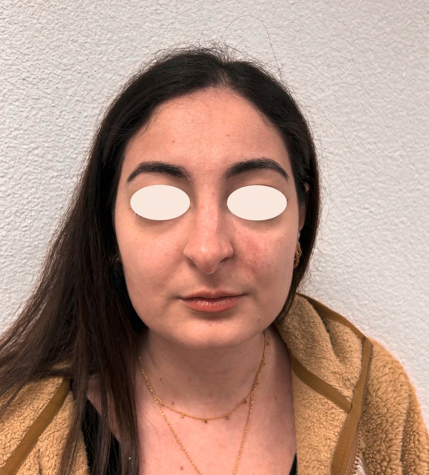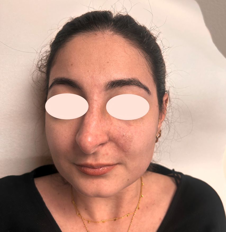 Eine 26-jährige Patientin stellte sich mit unklaren, progredienten Hautveränderungen vor, die nach einer ästhetischen Behandlung mit Hyaluronsäure(HA)-Injektion in einer Klinik für plastische und ästhetische Chirurgie in Italien auftraten. Ende Dezember 2024 wurde ein hyaluronbasierter Filler in den Nasenrücken, die Nasenflanken, die Nasolabialfalte und die Columella injiziert. Bereits während der Injektion im Bereich der oberen Anteile der Nasolabialfalte bzw. der Apertura piriformis verspürte die Patientin einen Schmerz. Weniger als 24 Stunden nach der Behandlung bemerkte sie eine sich verbreitende Blässe der Haut, woraufhin sie die behandelnde Ärztin kontaktierte. Diese empfahl eine Behandlung mit Aspirin sowie ein abwartendes Vorgehen.